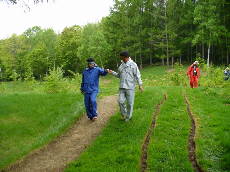 「裸足の道」は、さまざまな路面材が配置されている道を、パートナーの介助で、目隠しをし、裸足になって歩くものだが、小雨降る中で合羽を着ての体験となった。特に聴覚と足裏の感覚が研ぎ澄まされて、見たことのない大自然の中に踏み込んだような感じであった。
