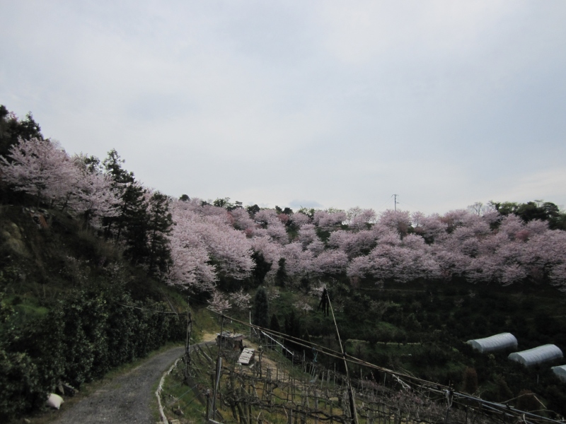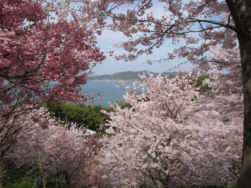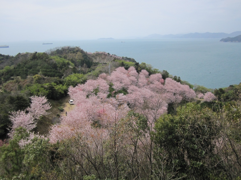 進入道路の整備が行われている鴨池海岸。それと一体的に続いている鳶烏山の中腹私有地に、見事な桜の群落ができている。ソメイヨシノより少し早く咲く陽光桜が大半を占めている。海を挟んだ波方町小部からも、鮮やかな色が浮き上がって見える。